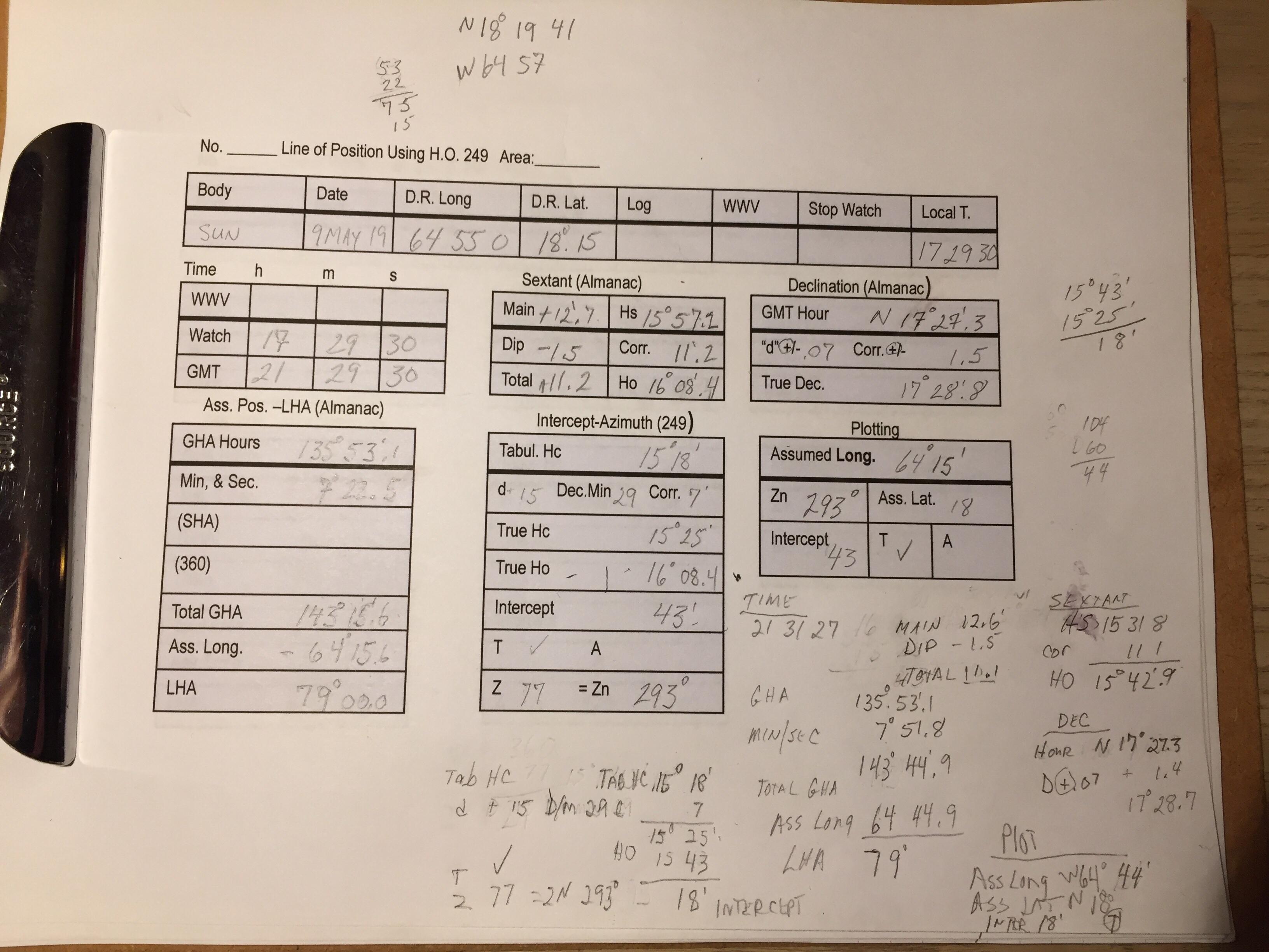 After reducing a bunch of shots I was running low on work sheets so I made a few by hand. I took shots and reduced them and plotted them out on the plotting sheet. I was getting pretty confident. This is not so hard I thought. Then, the next day, I could not reduce the sight. I was way off. I went back through the math and there it was, plain as day. I had transposed a critical number from the Almanac. I wrote down 105° 45’.5. But I should have written down 105° 54’.5. Thus, the calculation to get to Local Hour Angle was inaccurate, which meant the calculation derived from the tables in HO 249 were busted. I was tired…and I wasn’t even sailing.