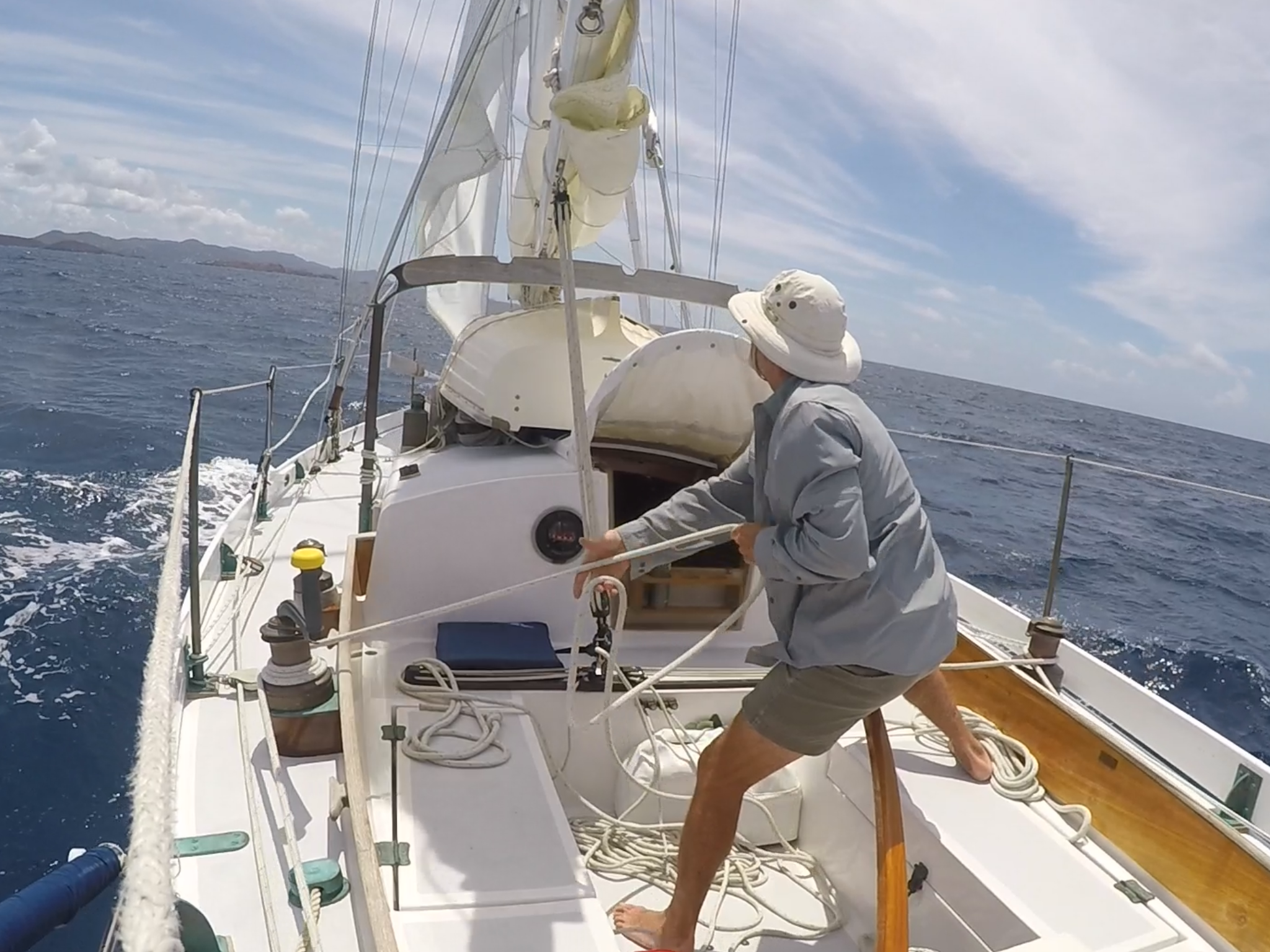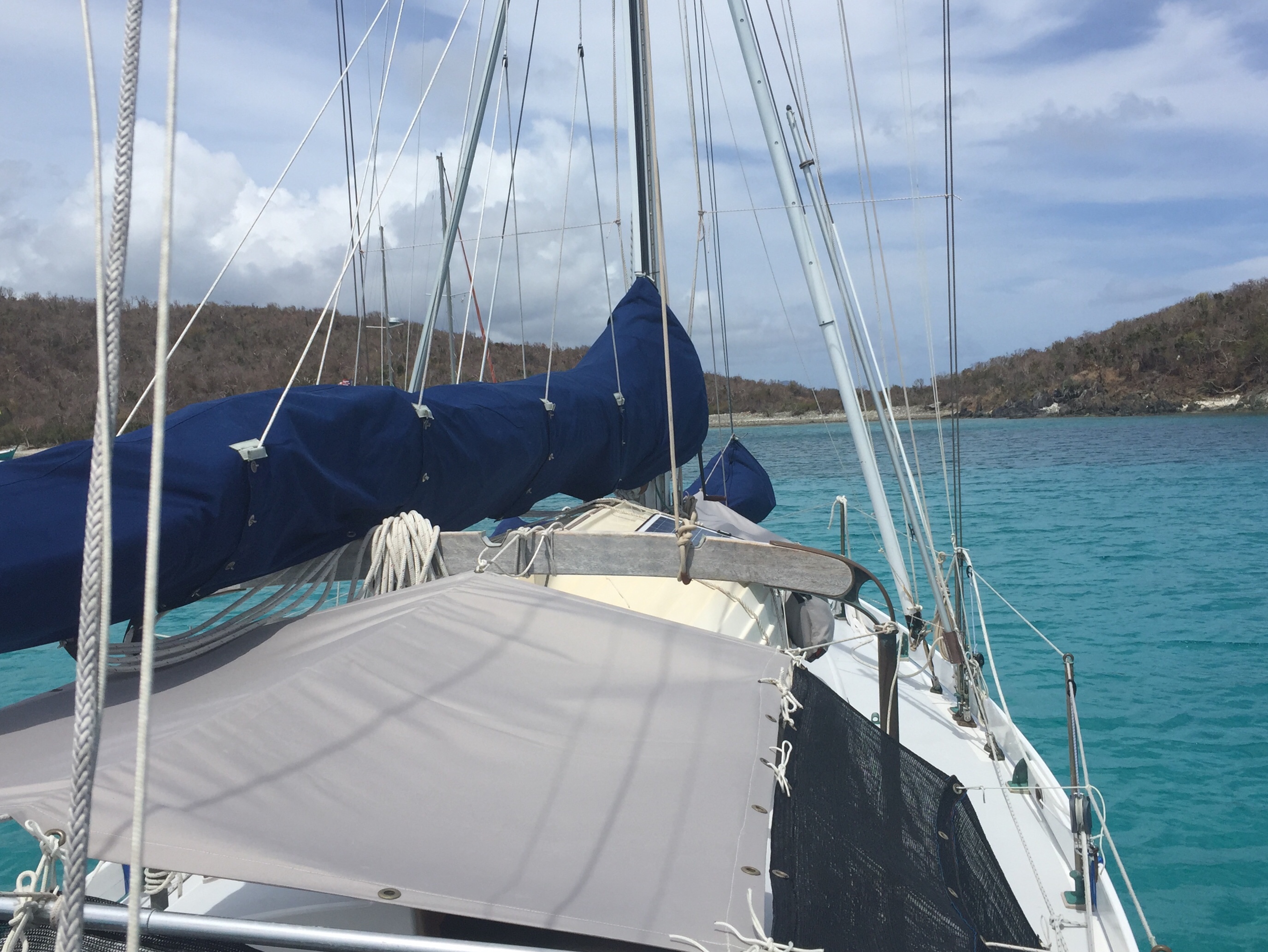 We beat east along the south coast of St Thomas tacking often to stay close to the coast and out of as much of the east swell as possible. It was a short sail…less than three hours. Gordo Cooper, our Cape Horn Windvane, did his normal magic, steering pretty much the whole way. If the swells are not too big he can even steer us through the tacks. But in these short steep swells, I disengaged Gordo, tacked the Far Reach by hand, reset Gordo with the remote course adjustment line, then reengaged him. Simple stuff.