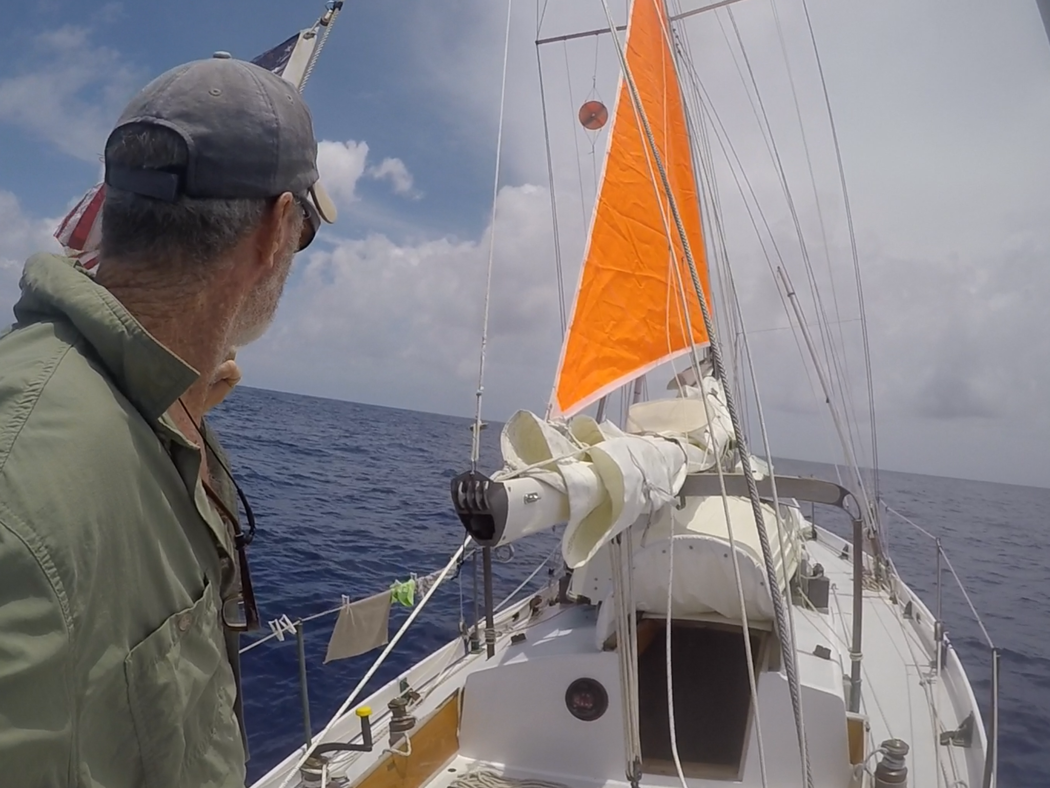 “It was tricky getting the working jib down while running down wind in 25 kts. I got the boat going as dead-down-wind as I dared. Then, I slacked the active jib sheet while hauling in the lazy sheet. Then I changed heading to a broad reach so the jib was back-winded. Let go the halyard and hauled on the jib downhaul and she dropped right on the deck—no problem. But it was dark as hell and a lot of noise and whooshing water, etc. Very scary but as I said went off without a hitch.”
