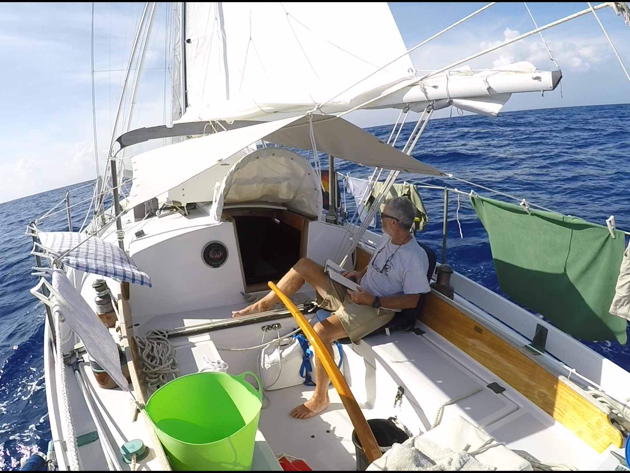 This is where having a windvane and an auto-pilot can pay off. In fact, most cruising boats have an autopilot even if they also have a windvane. But, since we don’t have an engine on the Far Reach or a large solar array we couldn’t generate the necessary power to operate an auto pilot very long. I’ll solve this problem though because the Cape Horn windvane is a critical component of the Far Reach. It is a superb self steering wind vane and other than its struggles in close combat with Sargasso it has worked flawlessly for us.