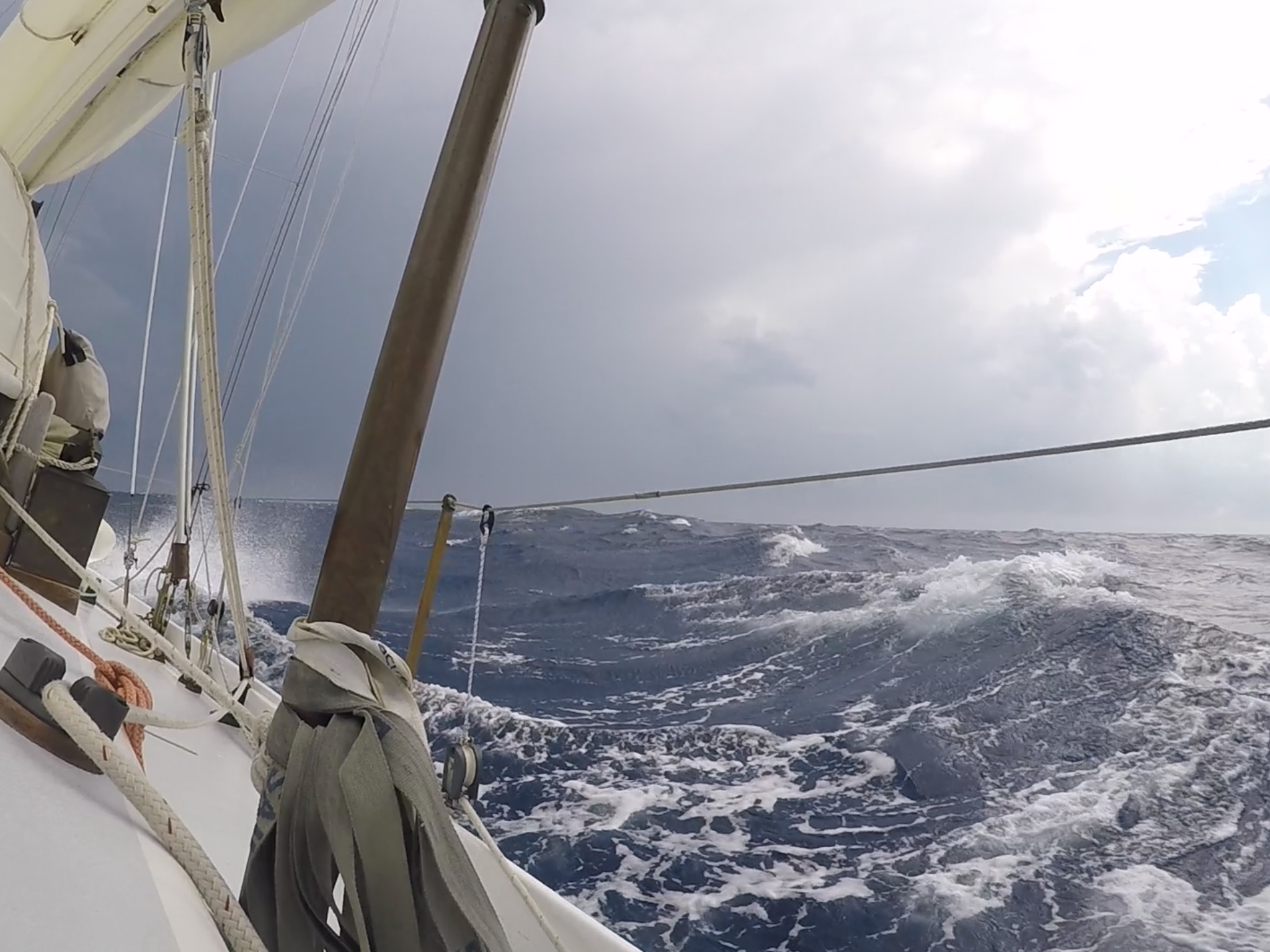 The Gulf Stream crossing turned out to be a real challenge. Though we needed to go NNW, we sailed NE and even E at one point then tacked to try to make westing then got headed and tacked back to the NE. Around 2300 we got hit with a 40 kt squall which we took with just a double reefed mains’l. I could not see the horizon so I had no idea if there were any squalls headed our way. From the log book at 2330:
