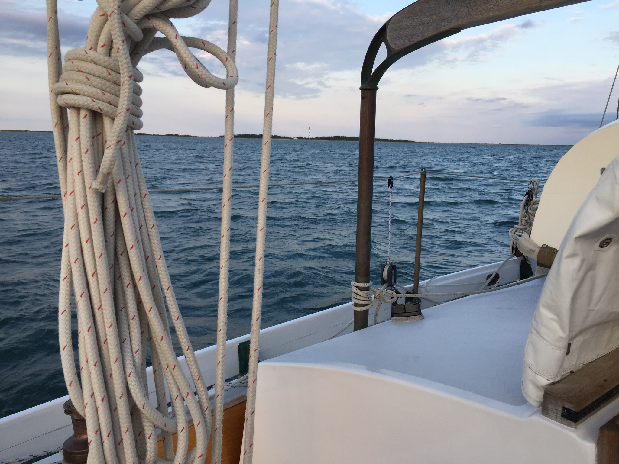 At 1545 we saw the Cape Lookout Lighthouse on a bearing of 035° magnetic. At 1825 we sailed into the Bight tacking three times to make it through the narrow entrance. We anchored in 25’ of water at 1830. Our voyage home was complete. We sailed 1,685 nm in 13.5 days. If you took out the two days we were hove to and the small number of miles we made on those days we averaged 138 nm a day.