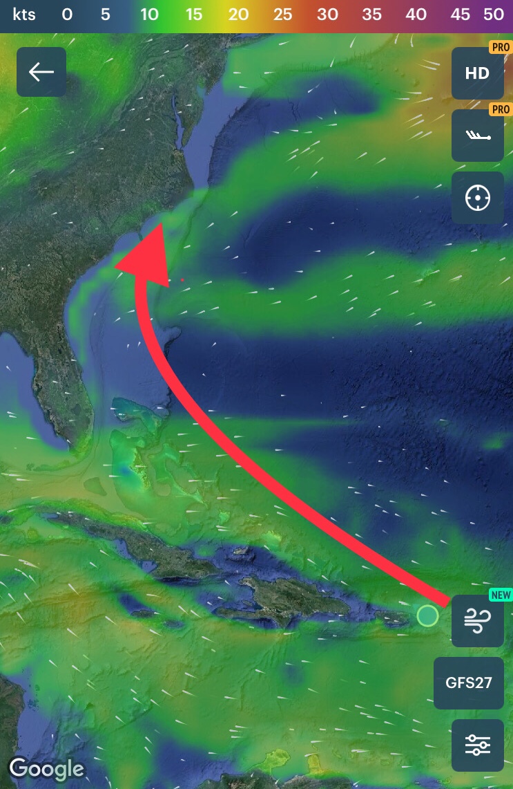 There was very little to no wind forecasted in large swaths of the Atlantic along the rhumb-line between the Virgin Islands and NC. Thus, my plan was to maintain a course along an arc curving to the south 60-80nm off the coast of the Bahamas since there was wind forecasted near the islands. The trick was to get close enough to land to keep the breeze but not get too close to shipping. I also wanted to maintain some sea-room if we suddenly found ourselves facing a tropical system.