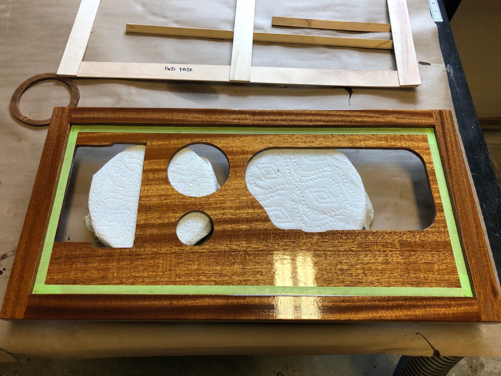 With the early test fit complete I cut the holes in the panel for the components. A little nerve racking. But, it went fine.  I still had not glued up the rails and stiles–just pushed together to see how it looked. I also needed to lightly radius the edges. Next, it was time to varnish.
