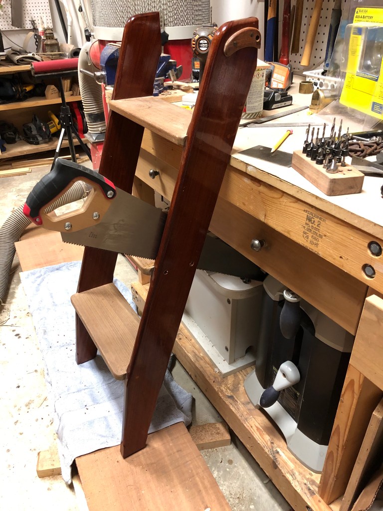 The companionway ladder I built for the boat during the six year rebuild worked beautifully. But, it would not work with an engine installed because the engine would be in the way. I developed a design where the work bench would be extended forward and the ladder cut down with the top step rails landing on the work bench. Then, the vertical panel I would need to build to cover the front of the engine would have a step integrated into it. Lastly, there would be a hinged bottom step allowing quick and easy access to the raw water seacock. Cutting up the ladder I so painstakingly built six years ago was not easy, though it was necessary. Boats that live long healthy lives, like the humans that love them, sometimes have to endure changes to adapt to new circumstances. I had a great time designing and building it back in 2014 and it performed wonderfully. But there was no way around it. I took some satisfaction knowing I was still using part of the ladder in the new design. So cut it down I did.