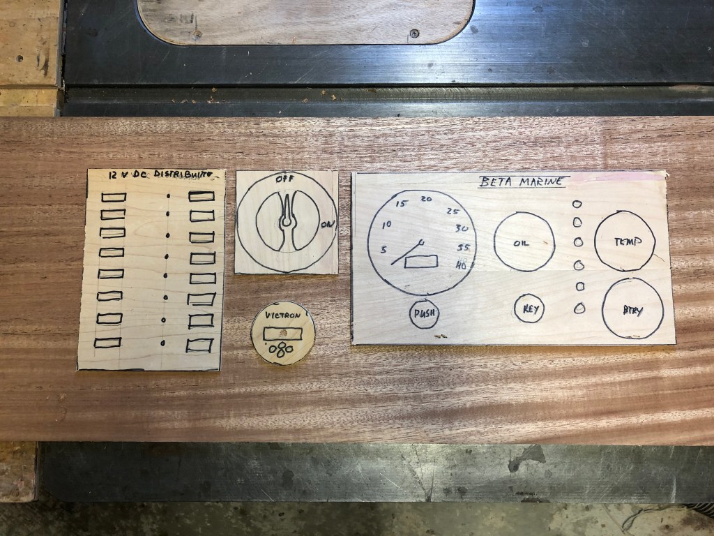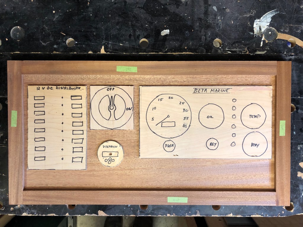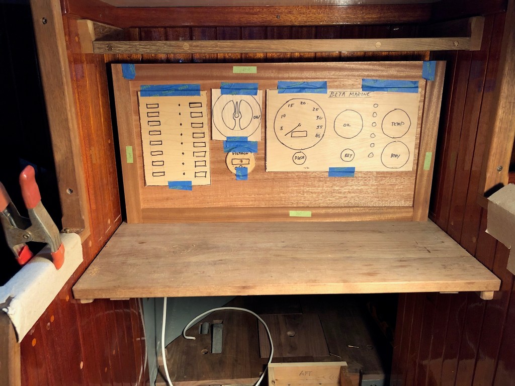 With the engine beds installed it was time to start work on the new larger electrical panel to replace the small one I used for the last five years. I decided to reuse the 8 breaker Blue Seas 12v panel. I only used four of the breakers before: 12v accessory plugs, LED lights (which I added for the second voyage to the West Indies), AIS, and compass light. I also decided to move the panel from its previously hidden location near the inboard side of the quarter berth to under the bridge-deck, where it would be more accessible, and combine it with the Beta Marine engine instrument cluster, battery monitor, and battery switch. The new panel will be hidden by sliding doors.