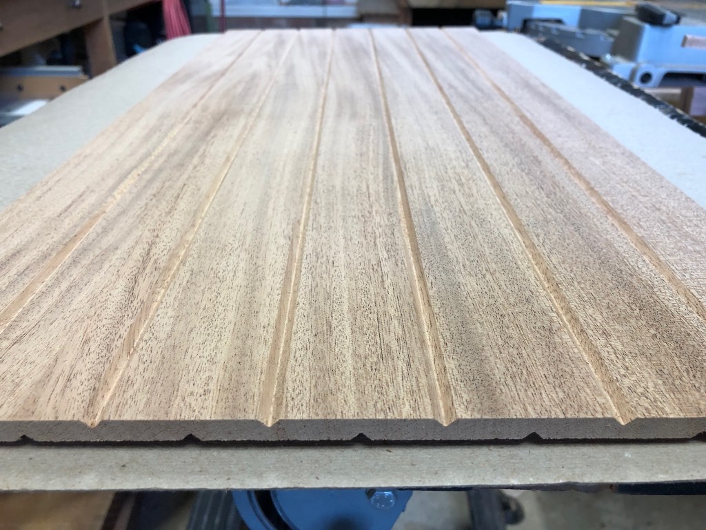 It is a similar technique to the method I used to make the V groove overhead plywood panels in the Far Reach. But, the doors are thin solid wood which can be difficult to stabilize so they don’t warp. My friend Kaj Jakobsen, a boat builder and a certified Swedish furniture maker, has taught me many interesting techniques. One thing he mentioned to me about thin solid wood panels is whatever you do to one side it’s a good idea to do the same thing to the other side so the wood receives the same stress and relief. So, I cut groves on both sides.