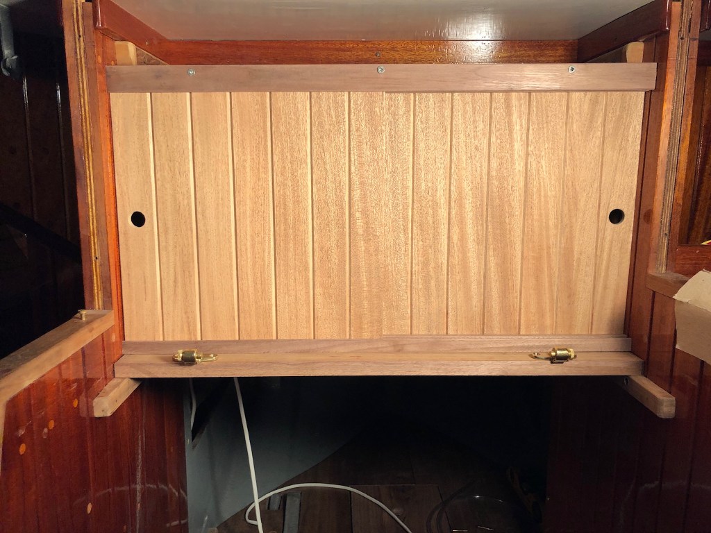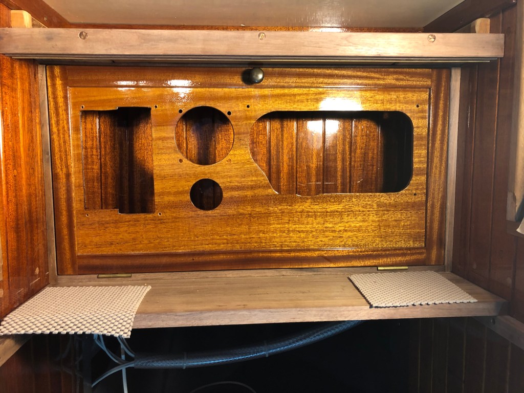 The slot above the panel door is where I stow the companionway drop boards. That way, they have a dedicated place yet are instantly accessible if I need to install them.
