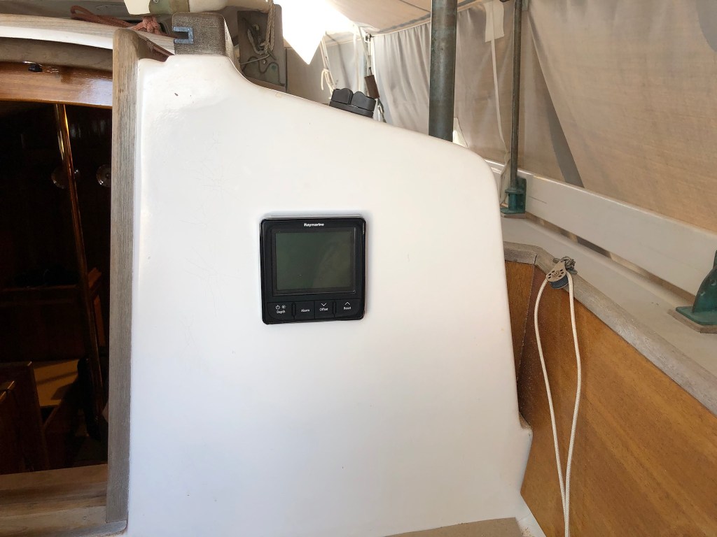 It took a long time to get to the point where I was ready to add a depth sounder. I have enjoyed “swinging the lead” and I will continue to use the sounding line because it connects me to those who went before. But, with the installation of an inboard engine I knew it made sense to add a sounder. I researched for the right one–reliable, accurate, and supports the transducer being mounted inside the hull to shoot through the fiberglass as I did not want any holes in the hull. I chose a Raymarine i50.