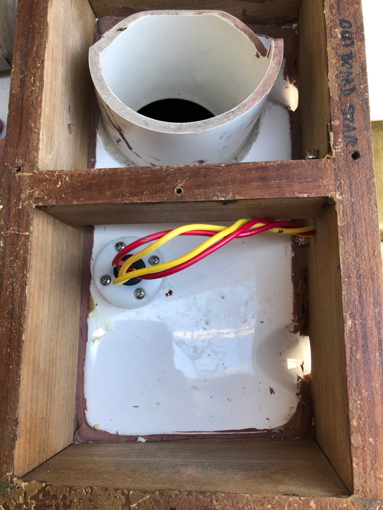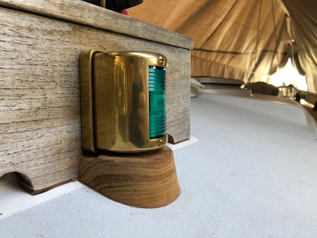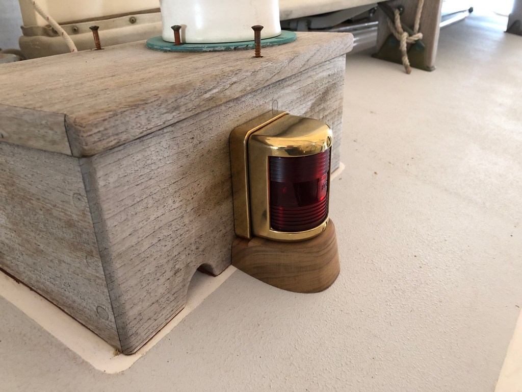 While the decision to add the LED nav lights was not simple or easy, I eventually got there and began looking for lights that would fit the style, layout, and philosophy for the Far Reach. My friend Kaj Jakobsen recommended the same lights he installed on his gorgeous self-built Lyle Hess 34′ Falmouth cutter Astrid. They are brass and are easily converted to LED. After lots of thinking (we are talking months here) I decided the best place was on the dorade boxes. The visibility was fairly unrestricted. They were protected. And, I could run the wires into the dorade and through a compression gland then back through the overhead and to the electrical panel. There would be double protection from water ingress.