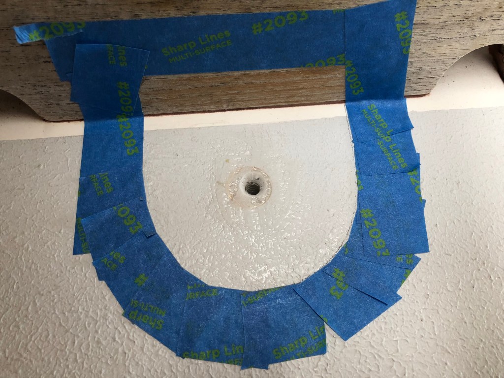 I drilled down through the base and into the deck. Then over drilled the hole and filled with epoxy. Next, I tapped the hole for a bronze machine screw. Finally, I bedded the base with teak colored polysulfide. This is a blind hole–it does not go all the way through the deck. So water can’t get into the boat or the cored deck.