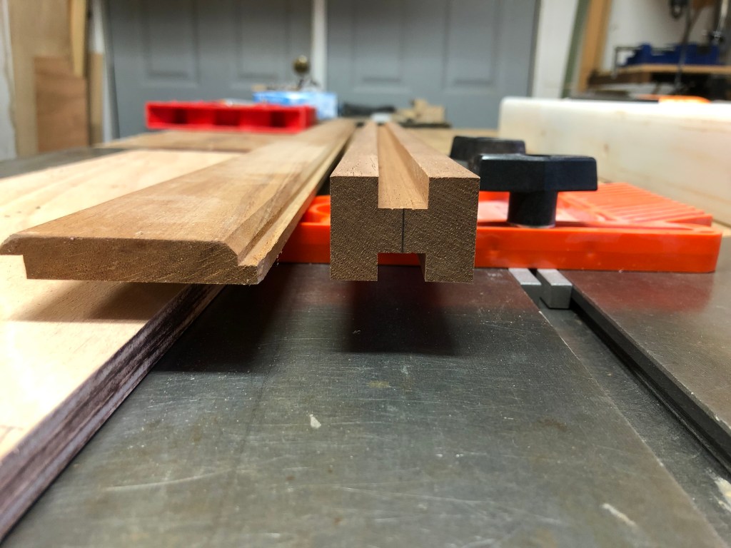 Next, I milled African Mahogany for the rails and stiles. I used a special router bit for cutting the slots for panel doors. I added shims to cut the slots for a proper fit–wide enough so the panel could float in the rails and stiles. Then, I checked the fit of the temporarily assembled rails and stiles to the space under the bridge deck.