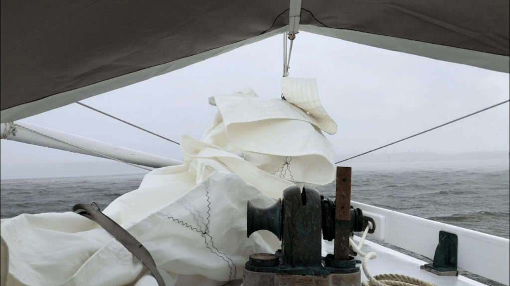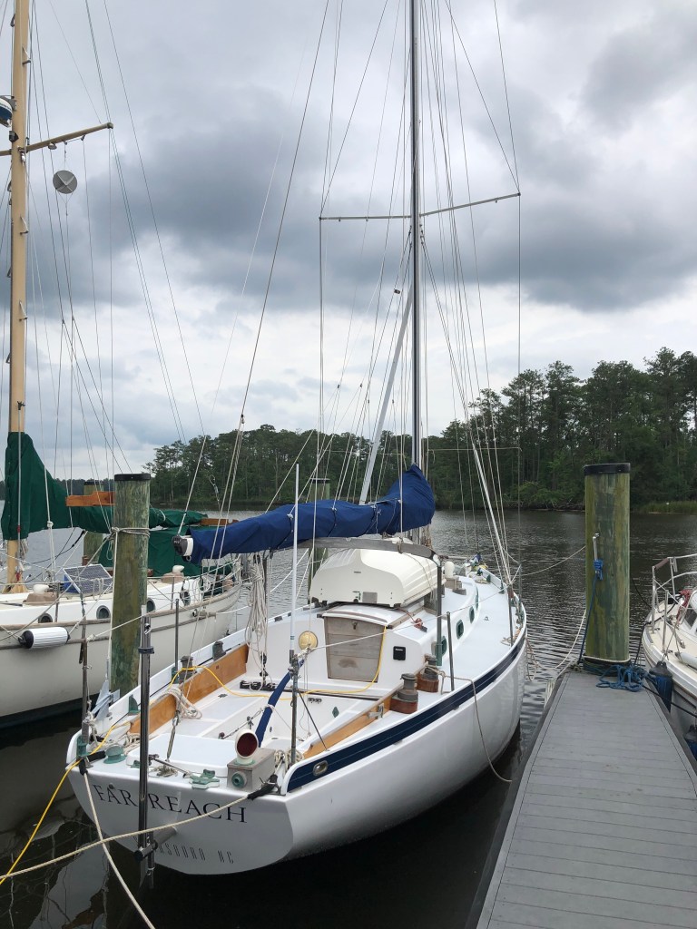 Back to launch day–After we motored about 7 miles we anchored for the night at the head of Adams Creek to enjoy being back on the boat. Next morning, we weighed anchor early and I spent about 30 minutes maneuvering the boat and getting a feel for how she handled. No issues in forward and she responded to the helm easily as long as we were moving forward. There is no thrusting from a dead stop against the rudder to force the stern one way or the other because the prop is behind the rudder. I will have to always allow for that fact. In reverse there is some prop walk to port which is useful. I was able to steer backward left and right but only in a light breeze and it takes a bit to get her going one direction then the other. Not great but manageable. Probably a little better than what I expected. My sense is it is all worth it for the efficiency we will have under sail with a folding propeller and no aperture. I also think I will learn her ways over time and find I can do a lot more with her under power in tight spots.
