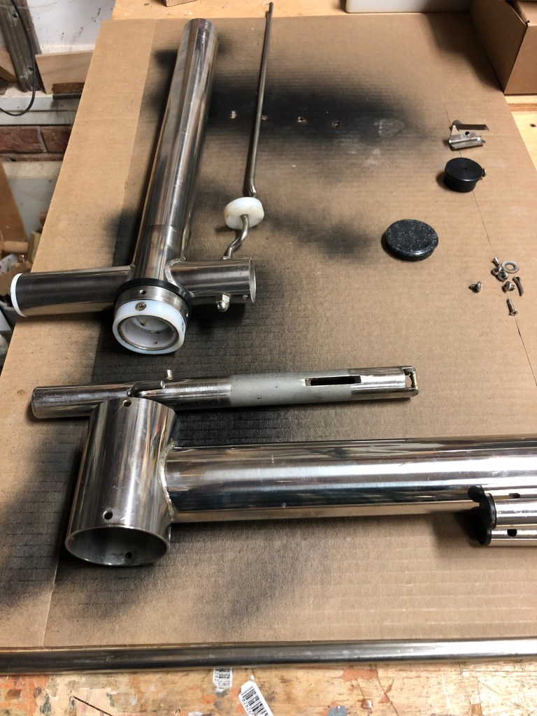 I removed the vane from the boat and brought it home. I rigged it up in the shop and manipulated the mechanisms to see what ailed it. Yves Gelinas, the designer and builder of the vane, and I emailed back and forth a few times. He asked a few questions and told me what to look for. None of those problems were detected. I did not know what else to do, so I took it apart like an assault rifle examining its components for anything that could be amiss. Once I had it in pieces I was stunned and maybe even a bit awed at how simple its design and construction and all the more impressed with Yves’ genius. It is a marvelous piece of simple engineering.