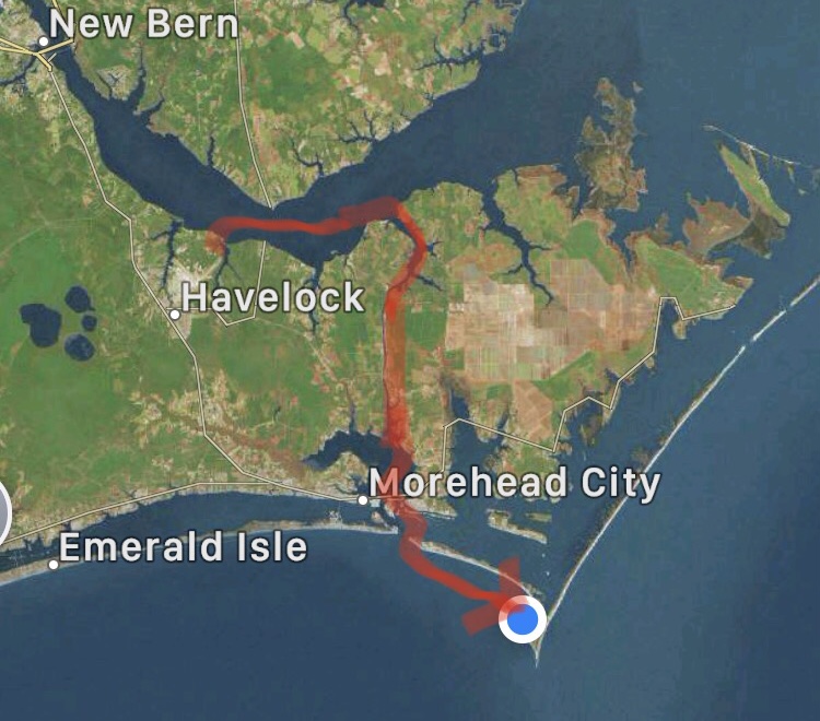 Morehead City (adjacent to Beaufort) NC–about 28nm. The engine worked perfectly. I admit it felt strange having an inboard engine on the Far Reach. We powered down the narrow Adams Creek at 2200 RPM making about 6 kts with the current. Once I arrived at at the turning basin, used by freighters, in Morehead City, I hoisted sails and we beat out to the Bight, part of the Cape Lookout National Seashore.