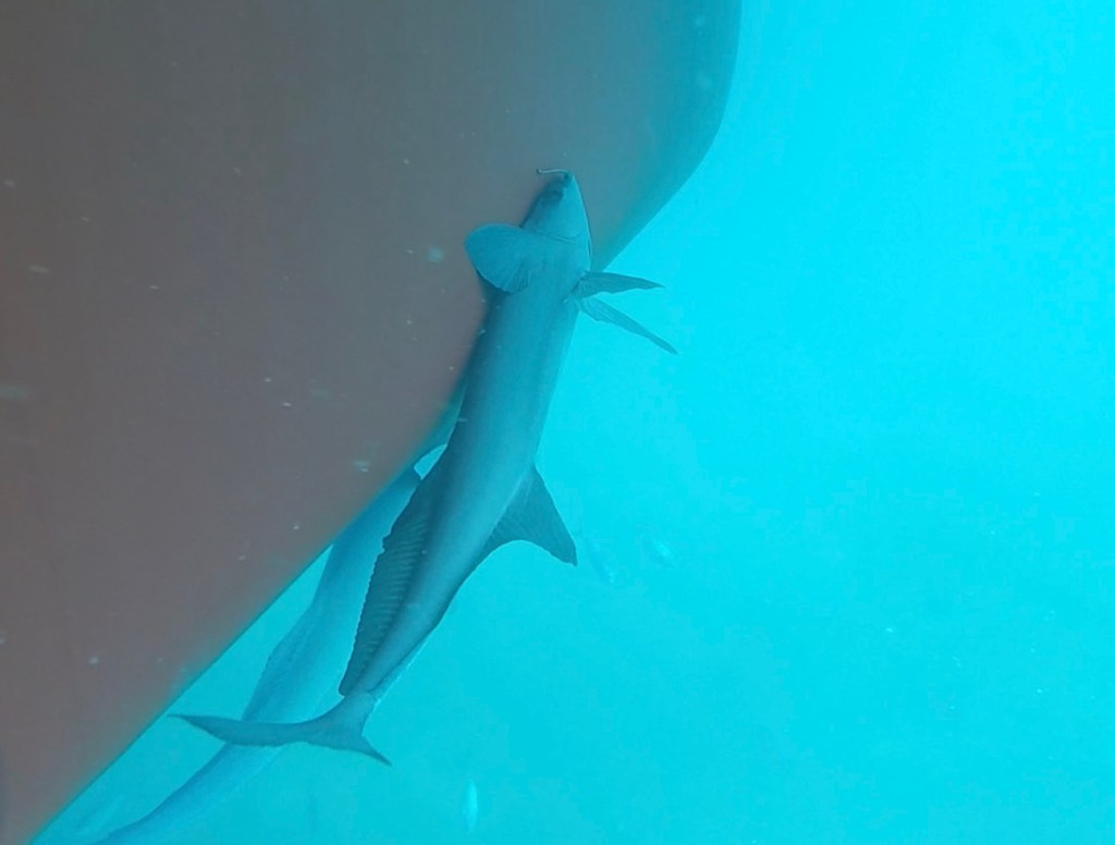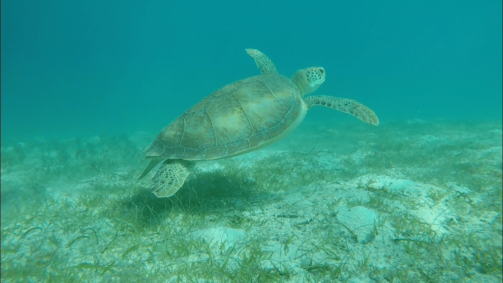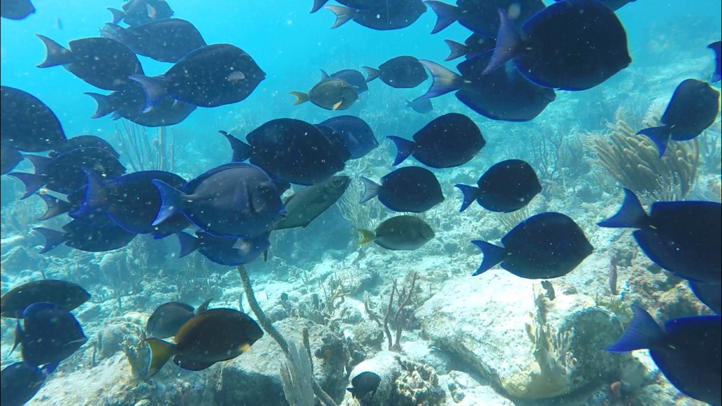 I swam with sea turtles, schools of fish (like the blue tangs below), remoras, and rays. I crossed paths with nurse sharks and once a very aggressive looking Lemon Shark. We swam past each other about 20’ apart going opposite directions. I stretched myself out to look as long as I could, LOL. I could see a mouth full of teeth and his eye moving to check me out but other than that he paid me no mind.