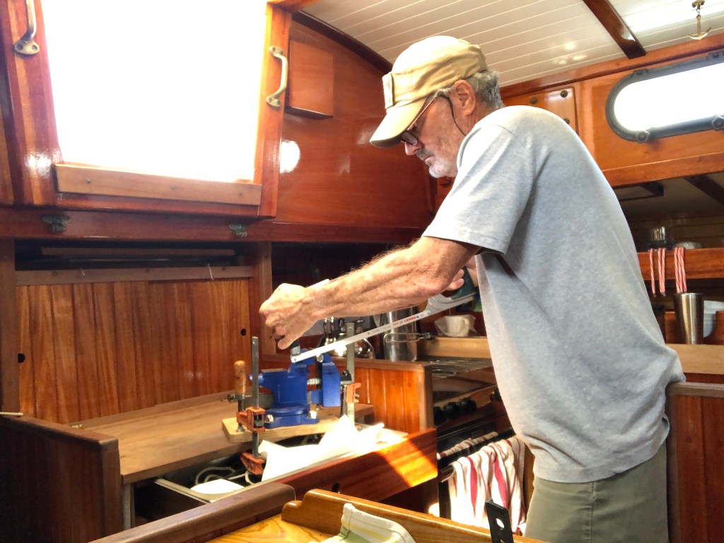 In early January the Vetus SISCO engine throttle/gear shifter locked up. It was only six months old and had barely any use. I contacted Vetus and they could not have been more helpful. They shipped me a new one which arrived in only a few days. I swapped out the old for the new in about two hours. I spent some time swimming and rowing—just getting fit again for life afloat. I worked on a few projects. My friend Tracy Geiger, who loaned me the mooring, came by with his wife Angie in his very cool inboard boat Limin’ to see how I was doing.