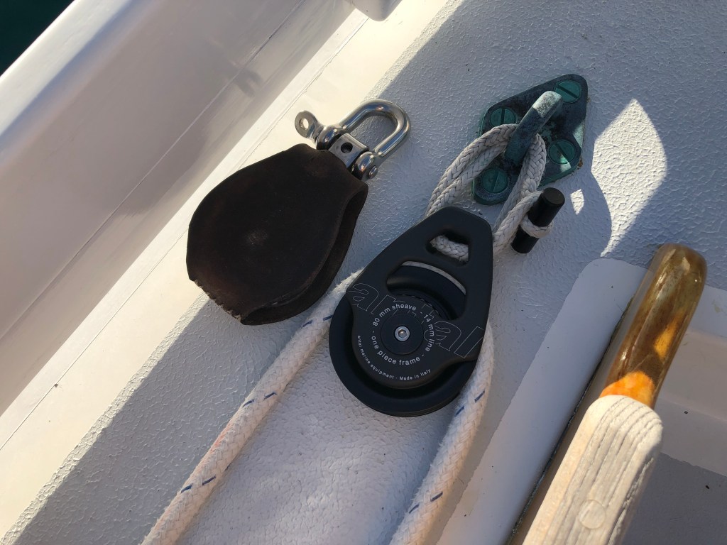 I broke a turning/foot block for the jib sheet on the voyage down. It was simply not strong enough for the task even though it lasted almost 10,000nm. I replaced both blocks with Antal ORF Series 80 blocks, a much better choice. I eliminated the stainless shackles on the old blocks incorporating Dyneema soft shackles which I made up in about 45 minutes.