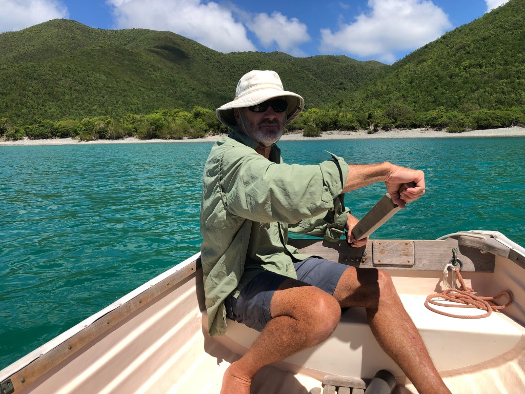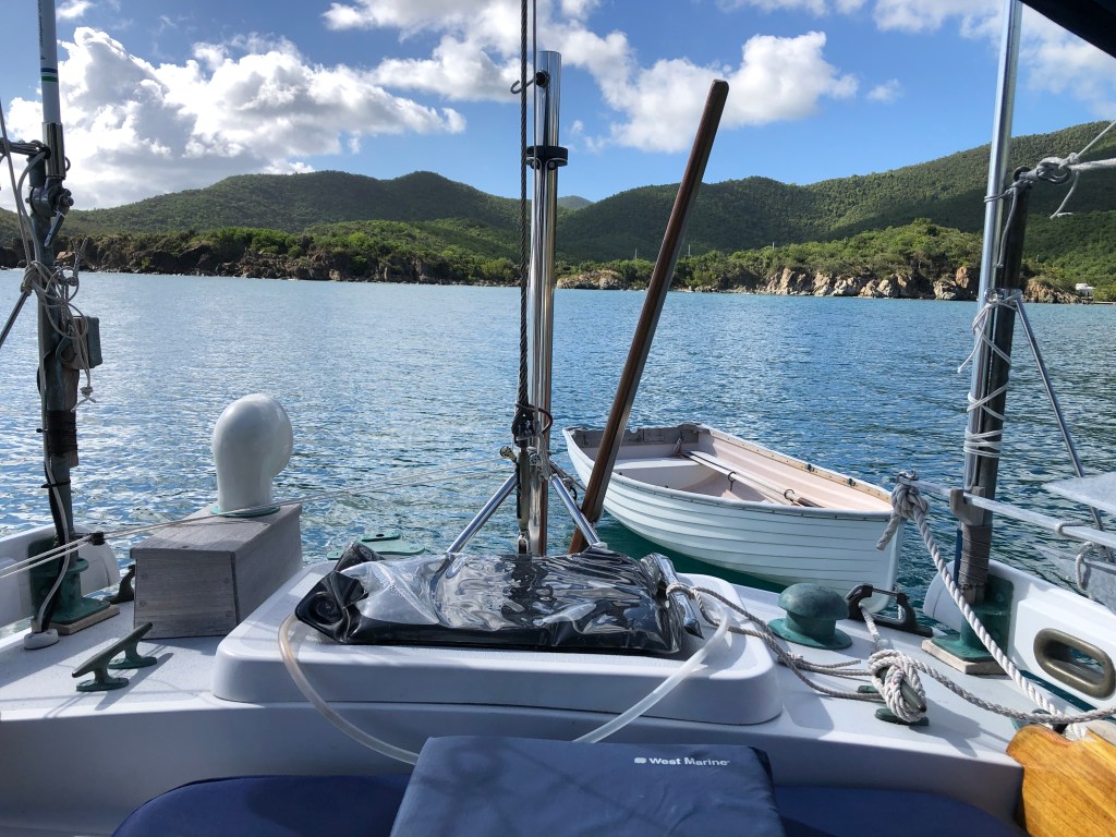 While we use the little outboard on Sweet Pea to get into the dinghy dock at Crown Bay Marina in St Thomas (they do not allow you to row into the marina!) we don’t use it anywhere else. I leave it stowed in the cockpit locker. When not rowing we are either sailing the dinghy or sculling it which is a wonderful way to move quietly on still water.
