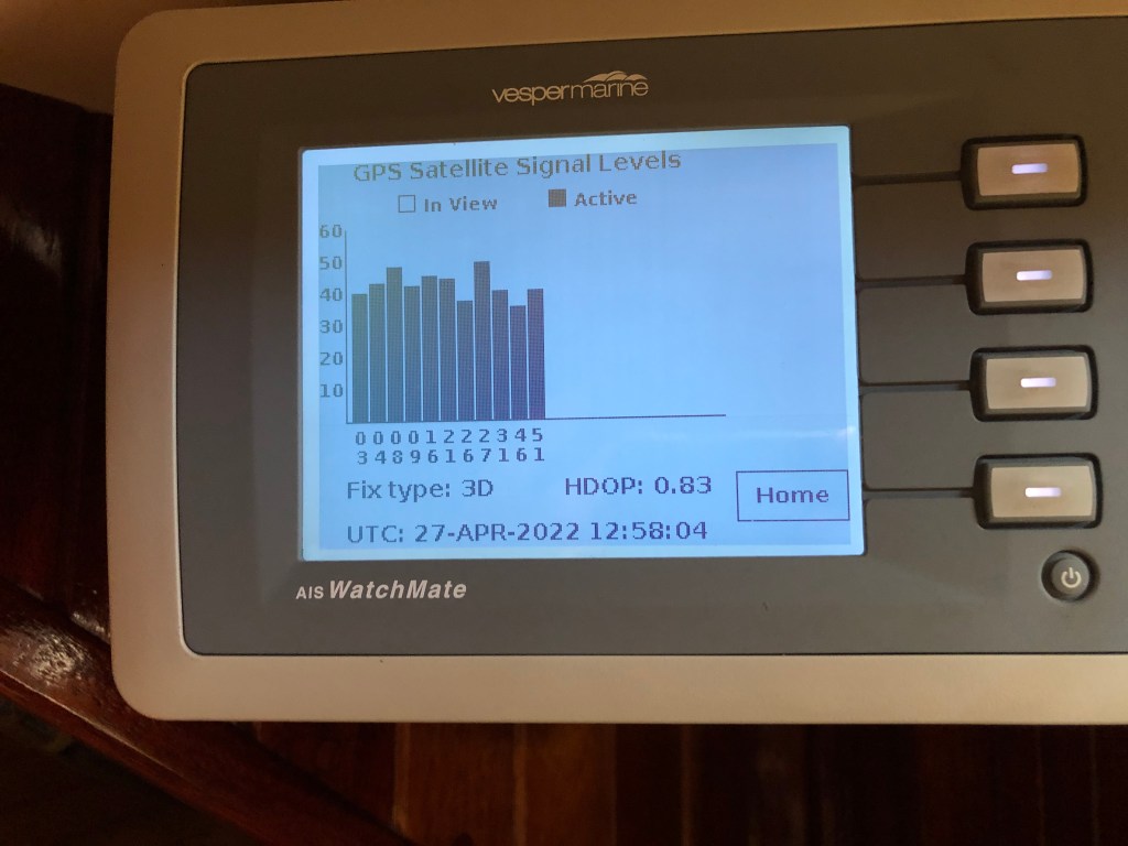 I took some time in April to upgrade my Vesper Watchmate 850 AIS by installing a dedicated external GPS antenna. It was something I had wanted to do for a while. The internal antenna had worked well enough but on the voyage down it occasionally lost position when the internal antenna lost contact though the deck with the GPS satellites. The “lost signal” alarm would shriek and wake me up out of a needed sleep. I would reset it to acquire the signal and sometimes it would take a while and I’d be sailing along in the dark with no way of knowing if there were ships nearby. With the internal antenna it took about five or more minutes to locate and lock on to the satellites. But, with the external antenna the satellite fix is almost instantaneous.