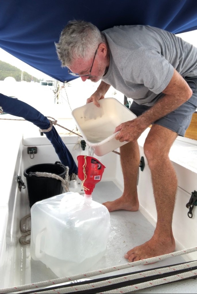 Throughout my time in the Virgin Islands I hauled water every one to two weeks. Typically I use about 1.5-2 gallons a day when I am anchored. I use a little less when I am sailing. When Gayle is aboard we use about 3-4 gallons a day. Water conservation is not something we have to work at on the Far Reach. Our simple systems sort of make it a natural thing. We take a hot shower on the boat every night and rinse off after swimming. I have never felt water deprived aboard the boat nor ever felt a longing for a long hot shower ashore. While water-makers are growing in popularity they are shockingly expensive ($5K-$10K uninstalled) use a lot of electrical power, and add significant complexity to a boat. They also require clear water to work properly.
